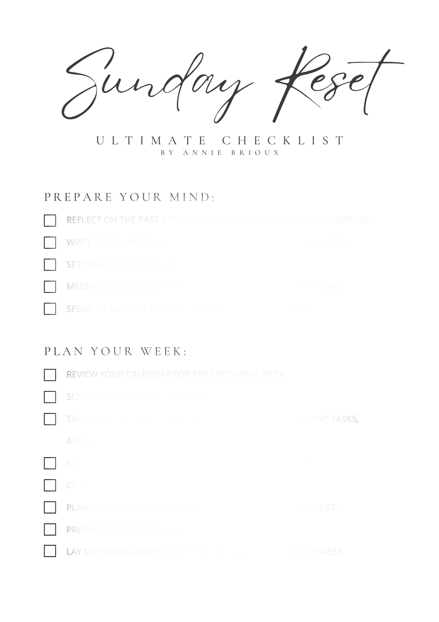 The Ultimate Sunday Reset Checklist is your blueprint for seizing control of your week. With this guide, you'll plot out your week in a way that makes sense for your personal and professional life, ensuring that when Monday rolls around, you're not just ready—you're ahead of the game.
